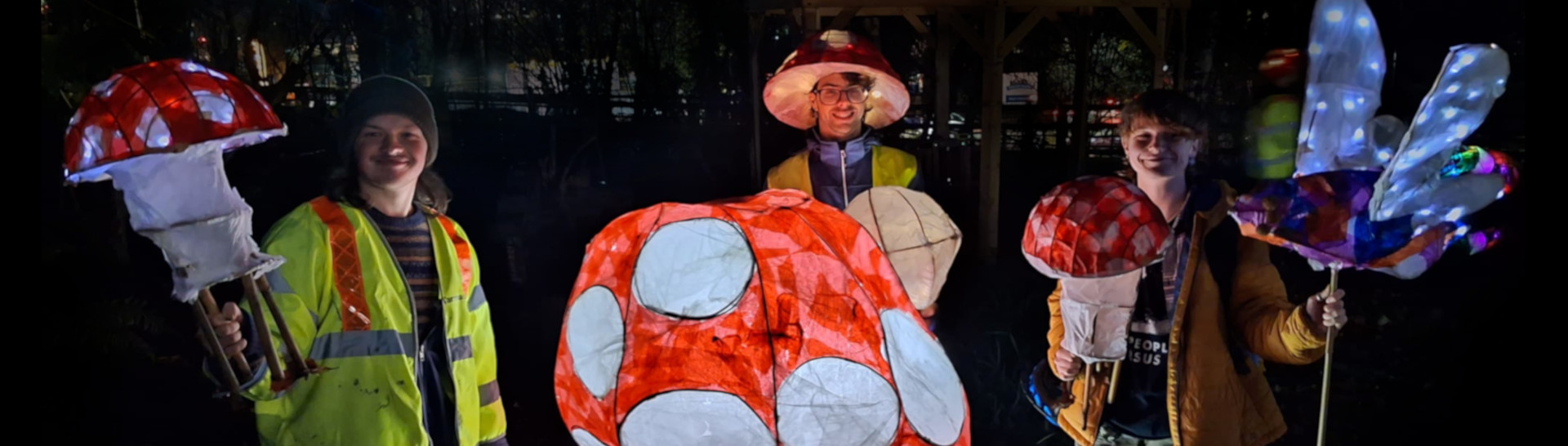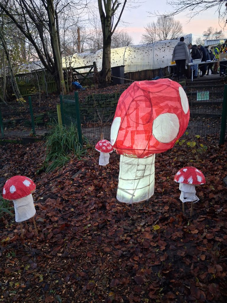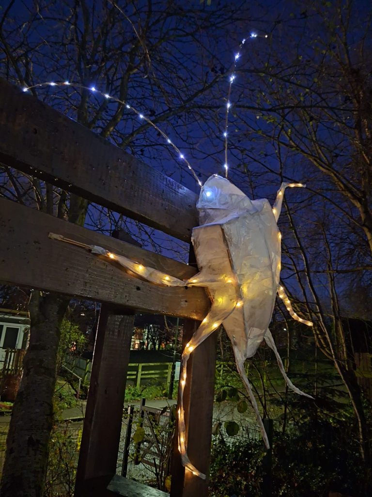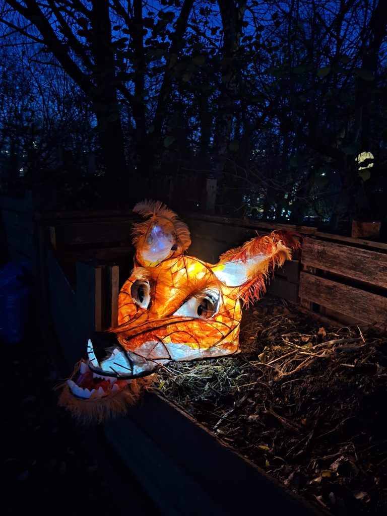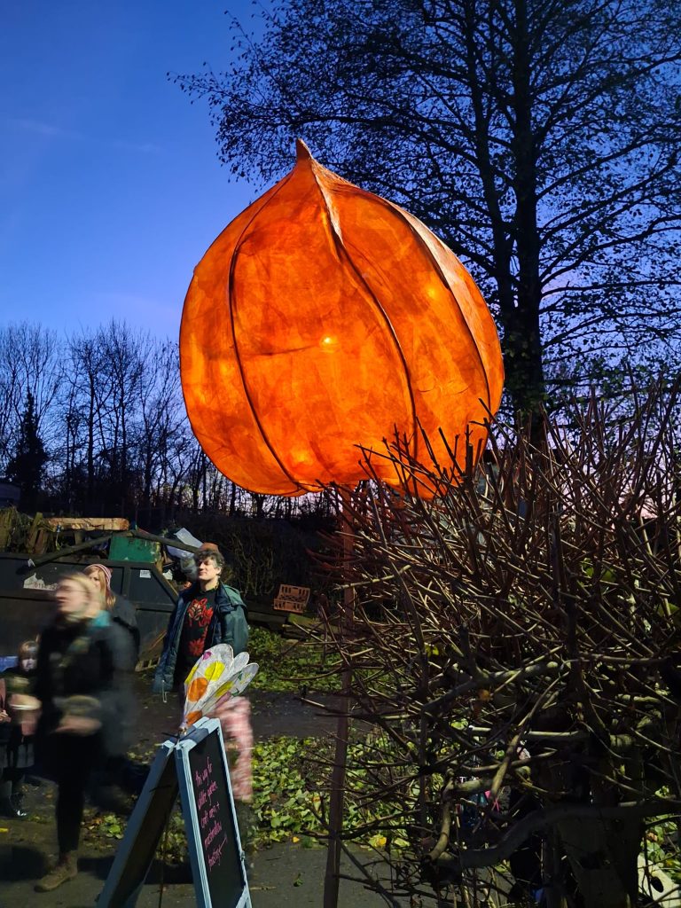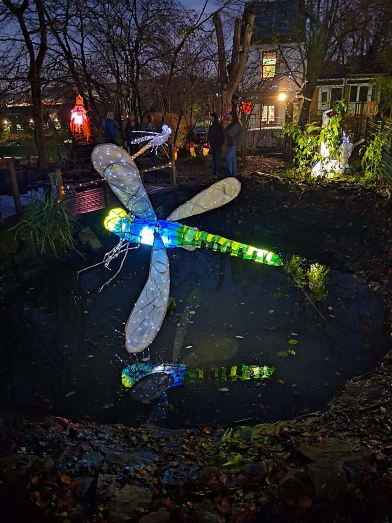 A collaboration with fellow artist, Jo Veal and Emma at Conder at Heeley City Farm to create a fairly low-key and chilled, illuminated evening, with a tour around their wildlife garden on an evening in early December. To run a couple of lantern-making workshops with the young volunteers (aged 16-24) at the farm, who had been working hard developing a new garden area with a pond.