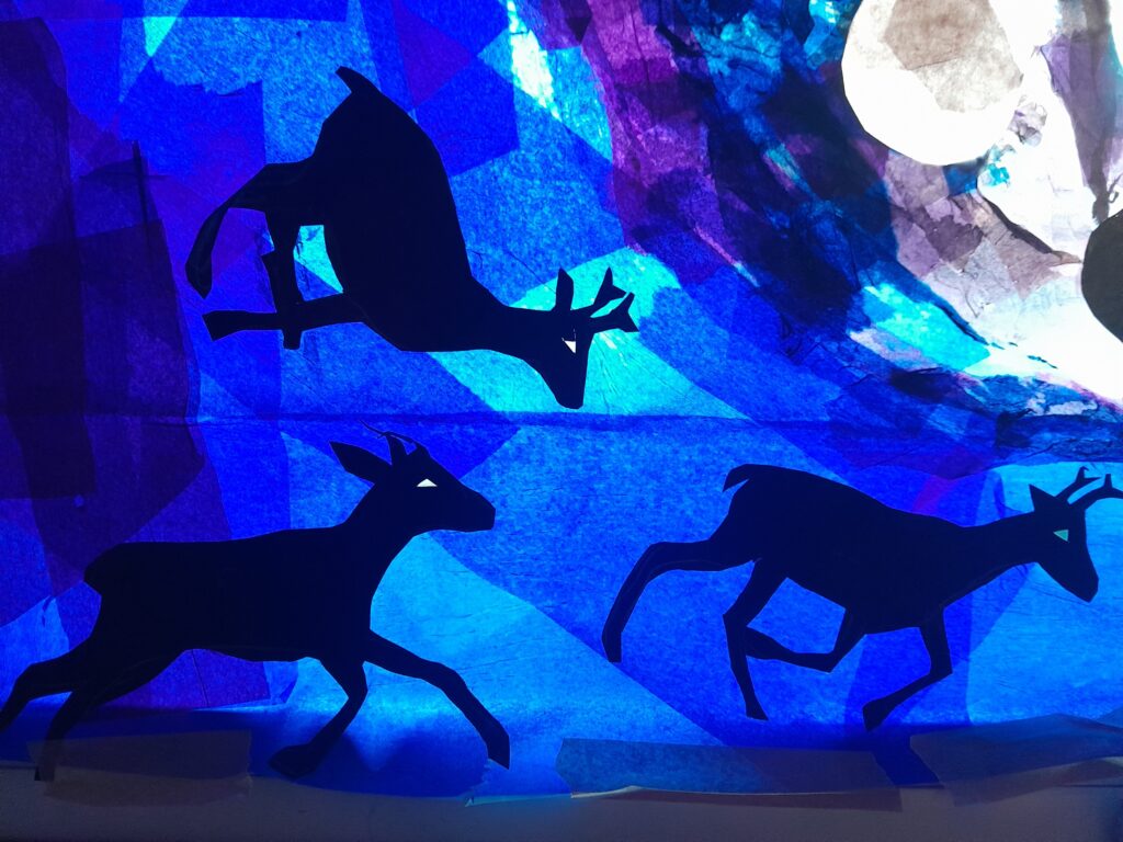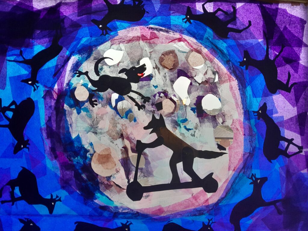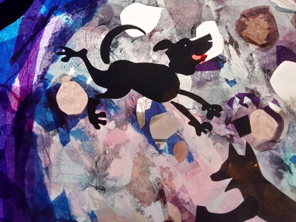 Made with tracing paper, tissue paper, black acrylic paint and a scalpel to cut away.
